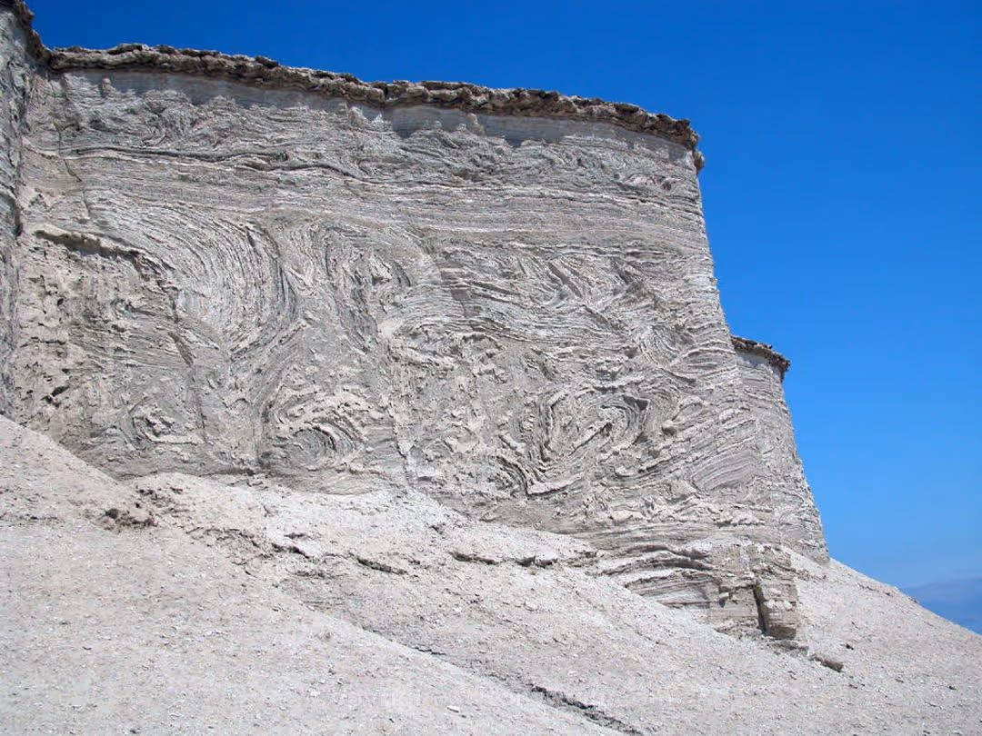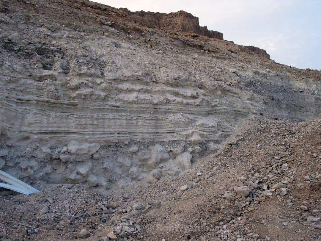 The site, "Admah", at the northern end of the Dead Sea, is exposed to a great deal of wind as it is located in an area not as well protected by the mountains. Also, its ash has turned sort of brownish on the outside, probably due to something in the wind settling on it. Whenever a section breaks away, the pure white color can still be seen inside.