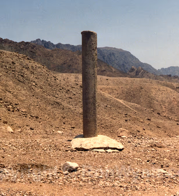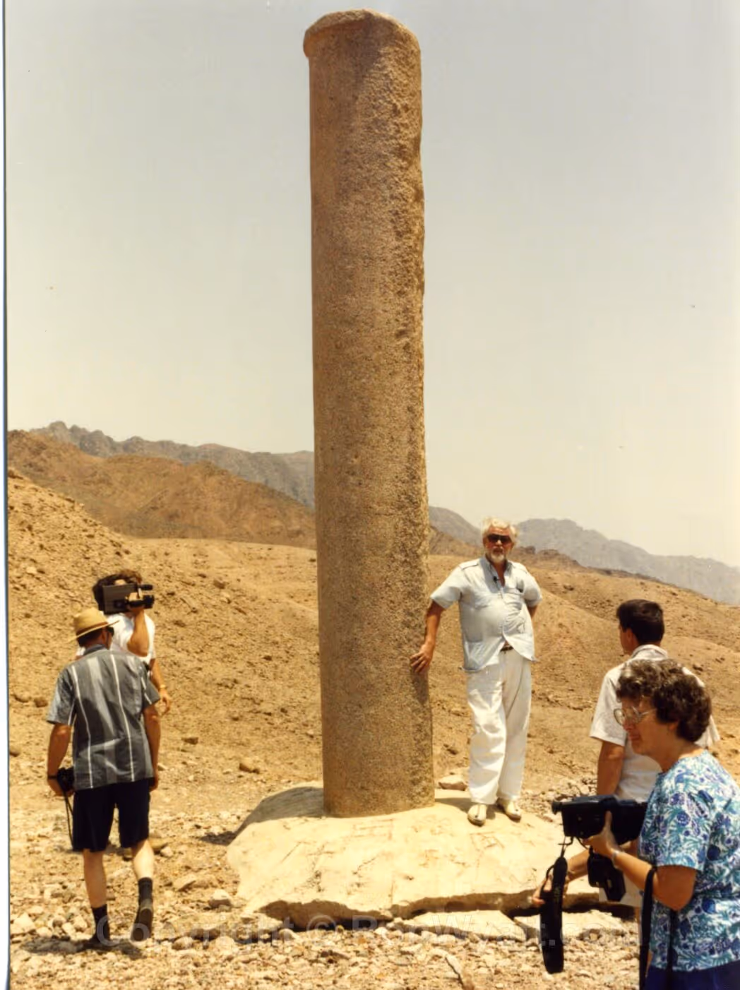 We didn't fully understand the importance of this column until a few years later-- we did recognize that it was definitely not of Egyptian style. But in 1984, when we were imprisoned in Saudi Arabia, our captors, in an effort to verify our story that we believed Mt. Sinai was there and that "Musa" (Moses) led the people across the sea to their country, had me take them to the beach where they arrived after passing through the sea. I directed them to the spot in a helicopter. Landing here, I found another column--identical to the one on the opposite shore-- except this one had the inscriptions intact. Noting carefully the Phoenician (Archaic Hebrew) letters, we were later able to have it translated. It contained the words: Mizraim (Egypt); Solomon; Edom; death; pharaoh; Moses; and Yahweh. From this, we knew that King Solomon had erected these columns in honor of Yahweh and dedicated them to the miracle of the crossing of the sea. And, that column possibly saved my sons' and my lives-- it proved what I had been telling my Saudi jailers!